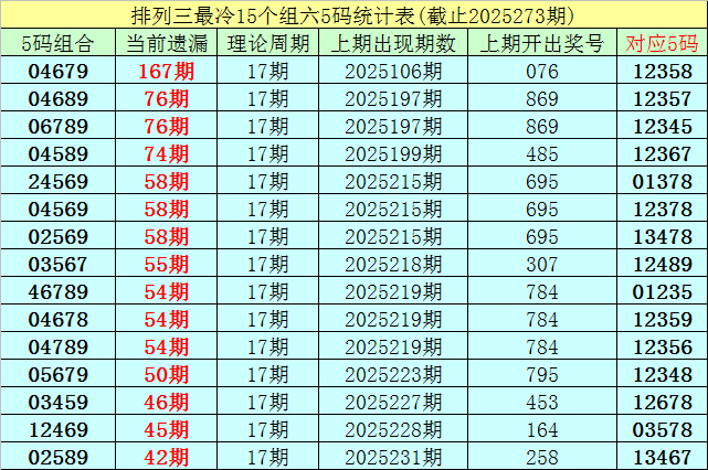 (5)排列三目前遗漏值最大的5码组六组合为:04679,本期遗漏167期,短期解冻的可能性较小,则25274期奖号分布在04679-12358之中的可能性最大。