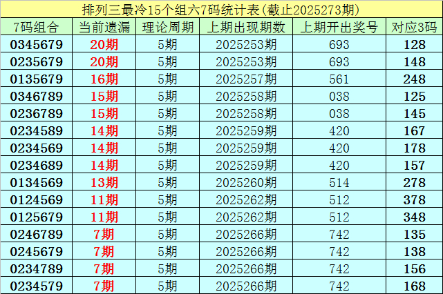 (1)在排列三已开出的7397期奖号中(统计截止第2025273期),目前7码组六遗漏值最大的组合为:0345679、0235679,本期遗漏20期;