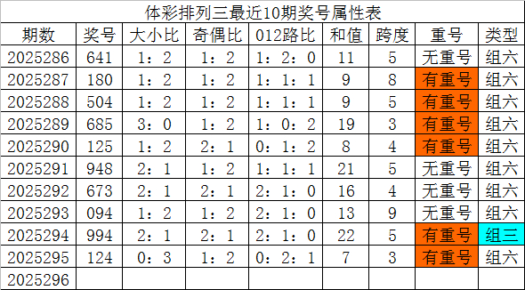 体彩排列三最近10期分别开出奖号:641、180、504、685、125、948、673、094、994、124,各奖号属性详见下表: