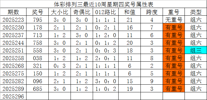 体彩排列三最近10周星期四奖号分别为:795、178、713、758、558、038、321、150、096、685,各奖号属性详见下表: