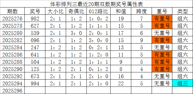 体彩排列三最近20期双数期奖号分别为:982、627、539、096、247、641、504、125、673、994,各期奖号详细属性下表: