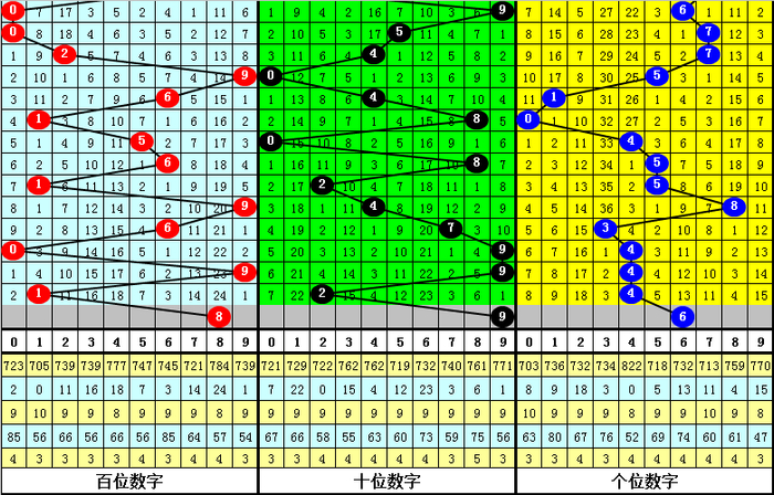 其中,号码0-9开出次数分别为:号码0开出3次、1开出4次、2开出2次、3开出1次、4开出6次、5开出3次、6开出3次、7开出1次、8开出3次、9开出4次。