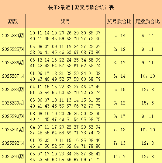 福彩快乐8第2025293期开出奖号:05 07 17 19 23 34 35 37 38 41 46 53 56 63 65 66 67 69 71 79,其中奖号质合比为11:9,奖号尾数质合比为12:8。