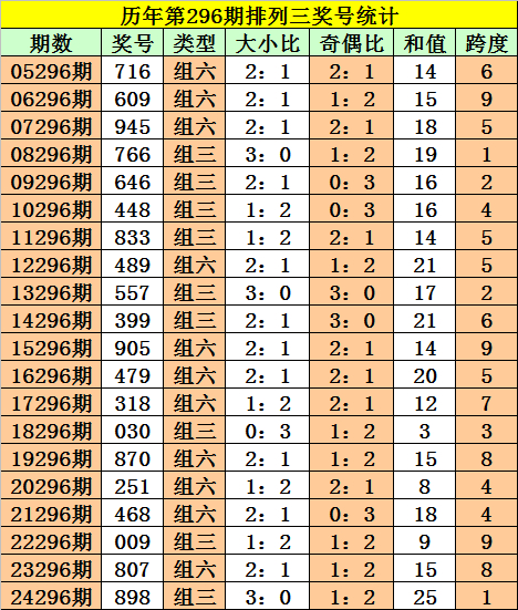 历年第296期排列三奖号:716 - 609 - 945 - 766 - 646 - 448 - 833 - 489 - 557 - 399 - 905 - 479 - 318 - 030 - 870 - 251 - 468 - 009 - 807 - 898。