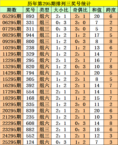 历年第296期奖号中:组三开出9次,组六开出11次。组三活跃,本期防组三再出。
