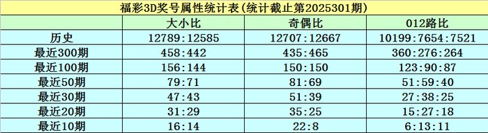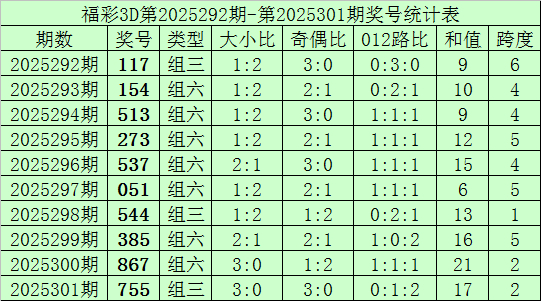 开奖回顾:福彩3D第2025301期奖号为755,其中奖号大小比为3:0,奇偶比为3:0,012路比为0:1:2,和值为17,跨度为2。
