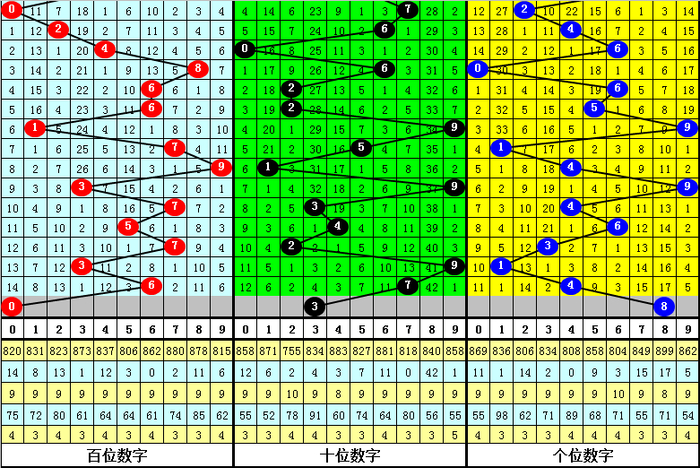 百位号码:第25264期-25268期奖号为:7-5-7-3-6,振幅为4点,奖号比较集中,本期看好百位走低,注意号码0。