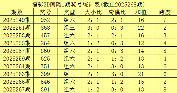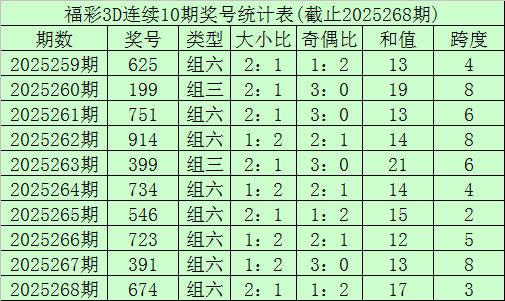 开奖回顾:福利彩票3D第25268期奖号开出674。奖号类型为组六,奇偶形态为偶奇偶,大小形态为大大小。