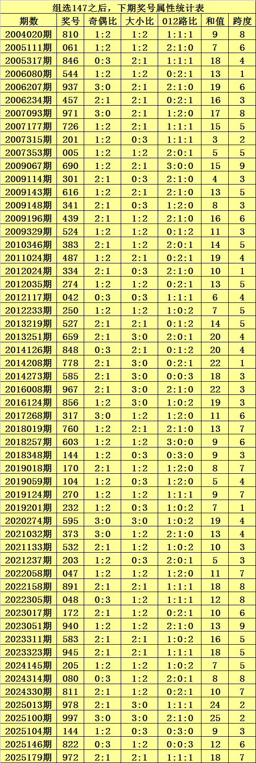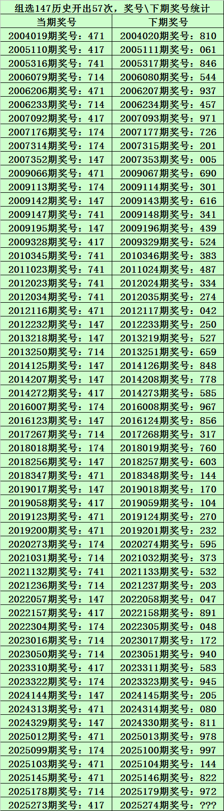 上期回顾:排列三第2025273期奖号为:417,类型:组六,历史上直选号码417出现了8次,组选号码147出现了57次。