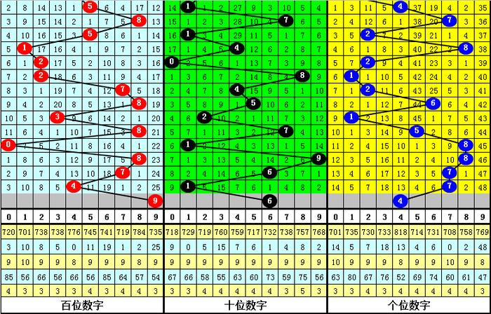 百位目前最冷号码为:9,当前遗漏25期,该号码历史最大遗漏为54期,本期防百位9解冻;