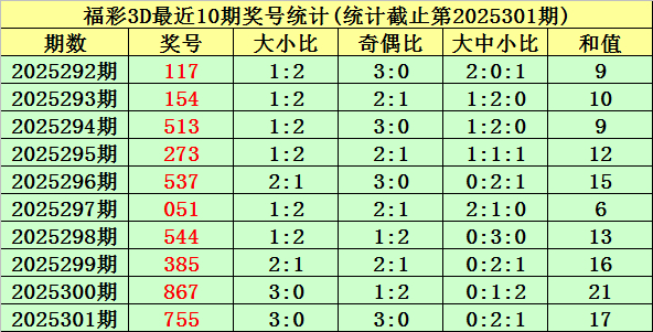 开奖回顾:福彩3D第2025301期奖号为:755。奖号类型为组三,和值为17,奇偶比为3:0,跨度为2,012路比为0:1:2,大小比为3:0。